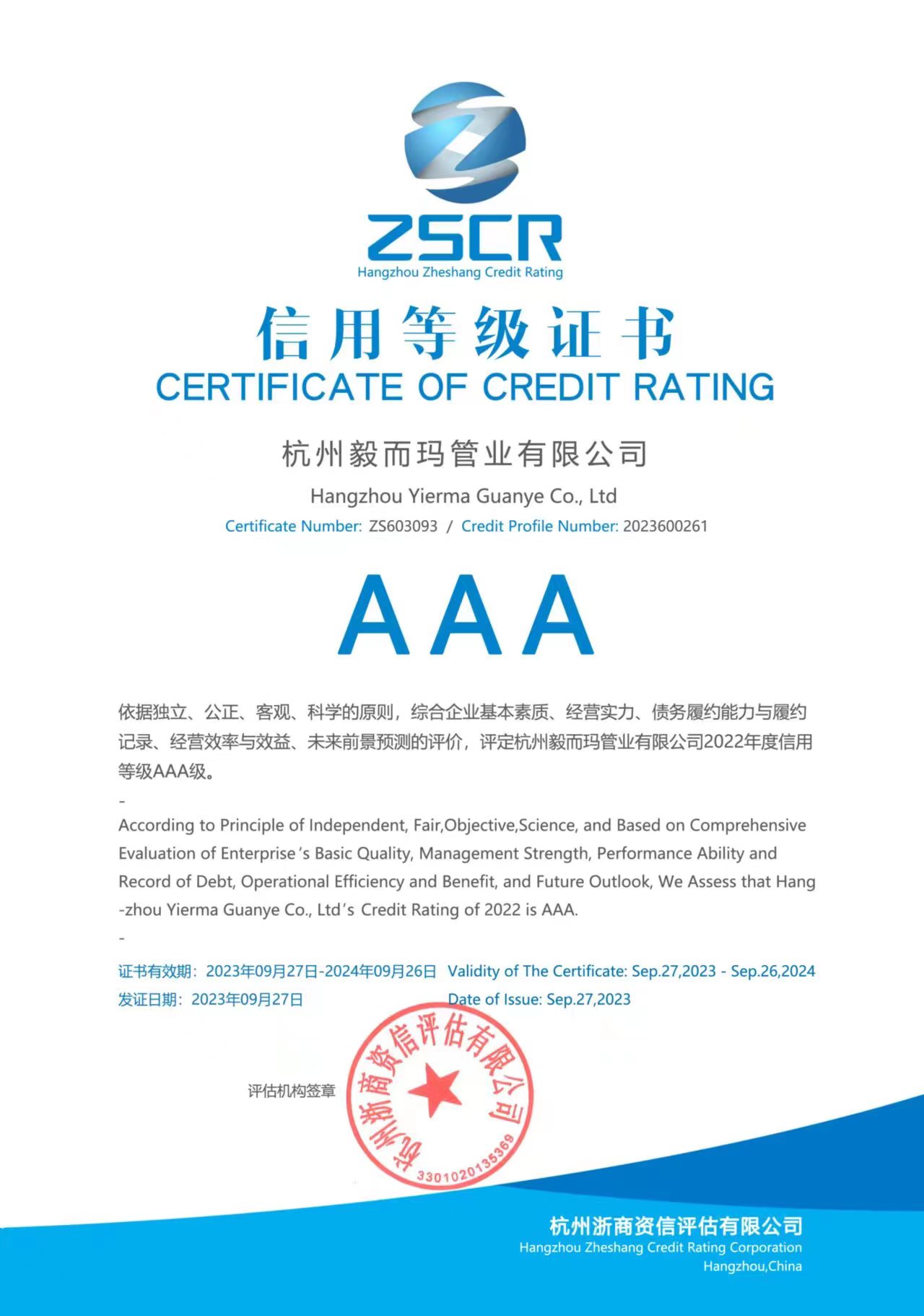 AAA信用等级证书